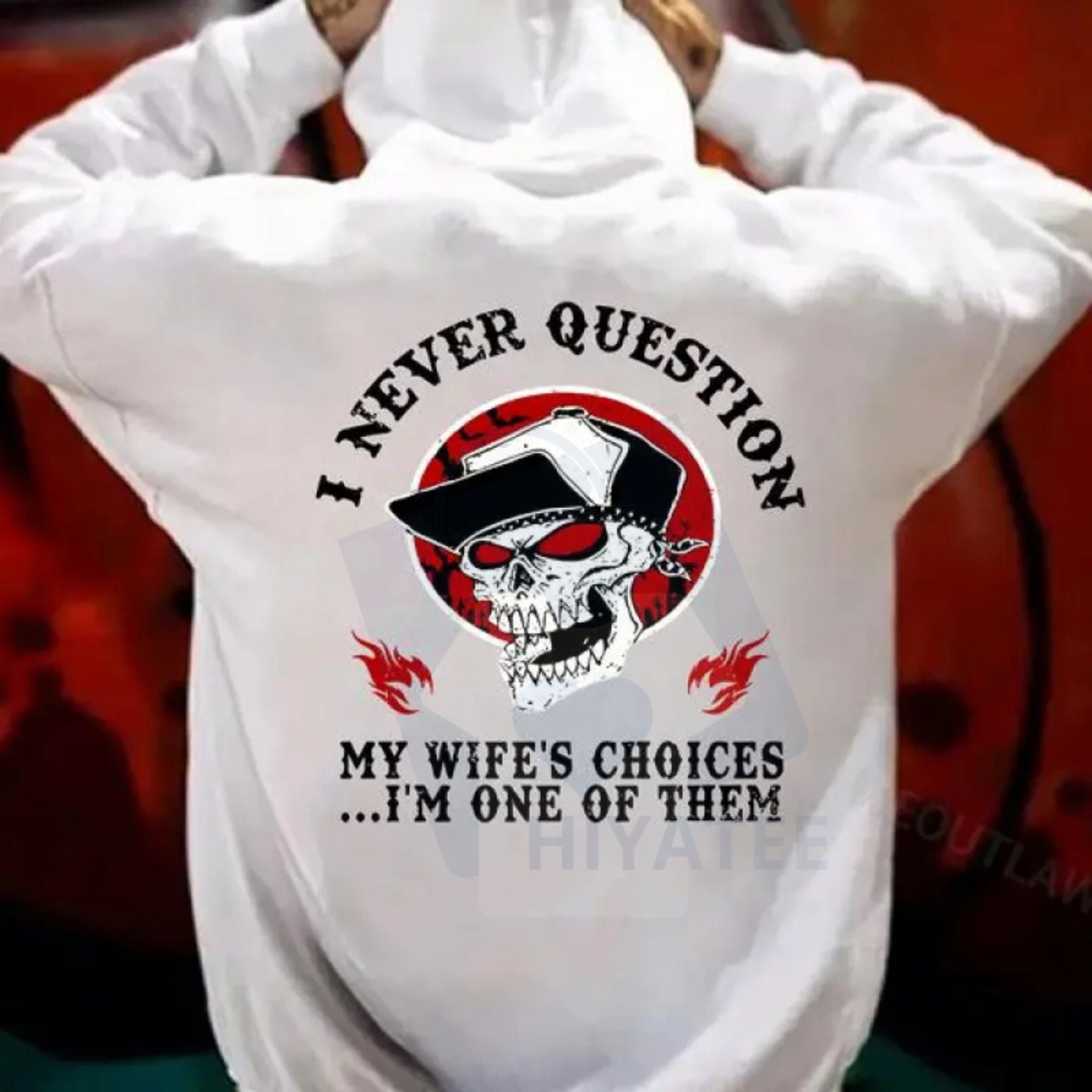 "I Never Question My Wife's Choices" Hoodie & T-Shirt – Funny Skull Graphic Design, Sarcastic Spouse Apparel, Humorous Gift for Husband